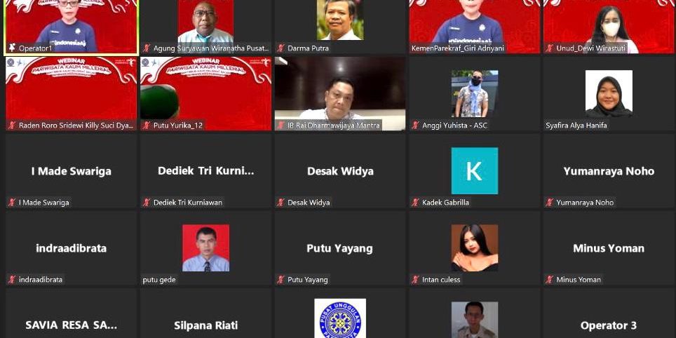 Pusat Unggulan Pariwisata (PUPAR) Unud sukses menyelenggarakan webinar pariwisata dalam rangka memperingati hari Sumpah Pemuda, Kamis, 28 Oktober 2021. Webinar bertema “Kontribusi Kaum Millenial dalam Pembangunan Pariwisata” diikuti lebih dari 420 peserta. Webinar dibuka oleh Sekretaris Kementerian Parekraf/Barekraf, Dra. Ni Wayan Giri Adnyanyi, MSc., CHA., dan pemberian sambutan oleh Ketua Lembaga Penelitian dan Pengabdian kepada Masyarakat (LPPM) Unud yang diwakili Sekretaris Ir. Ni Made Ary Esta Dewi Wirastuti, ST., MSc., PhD.